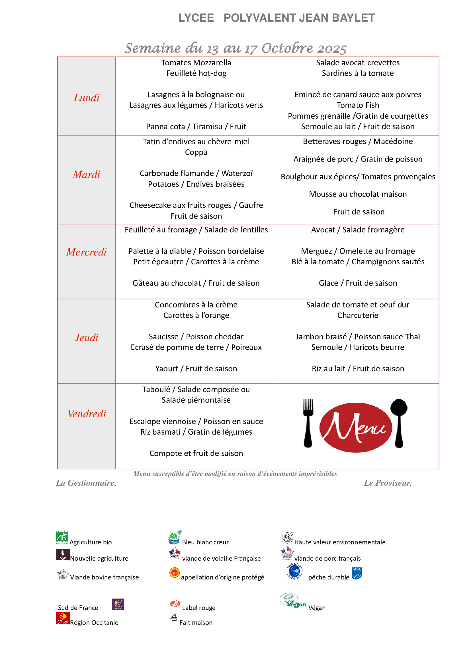 Menu de la semaine